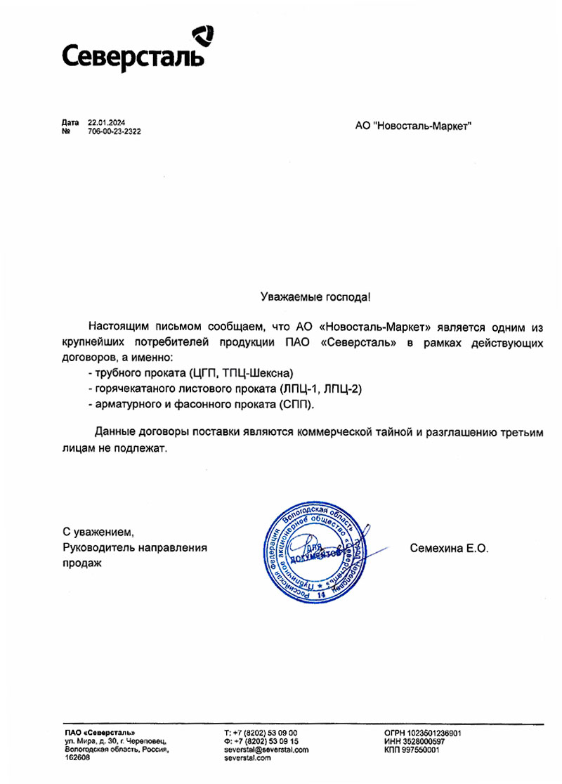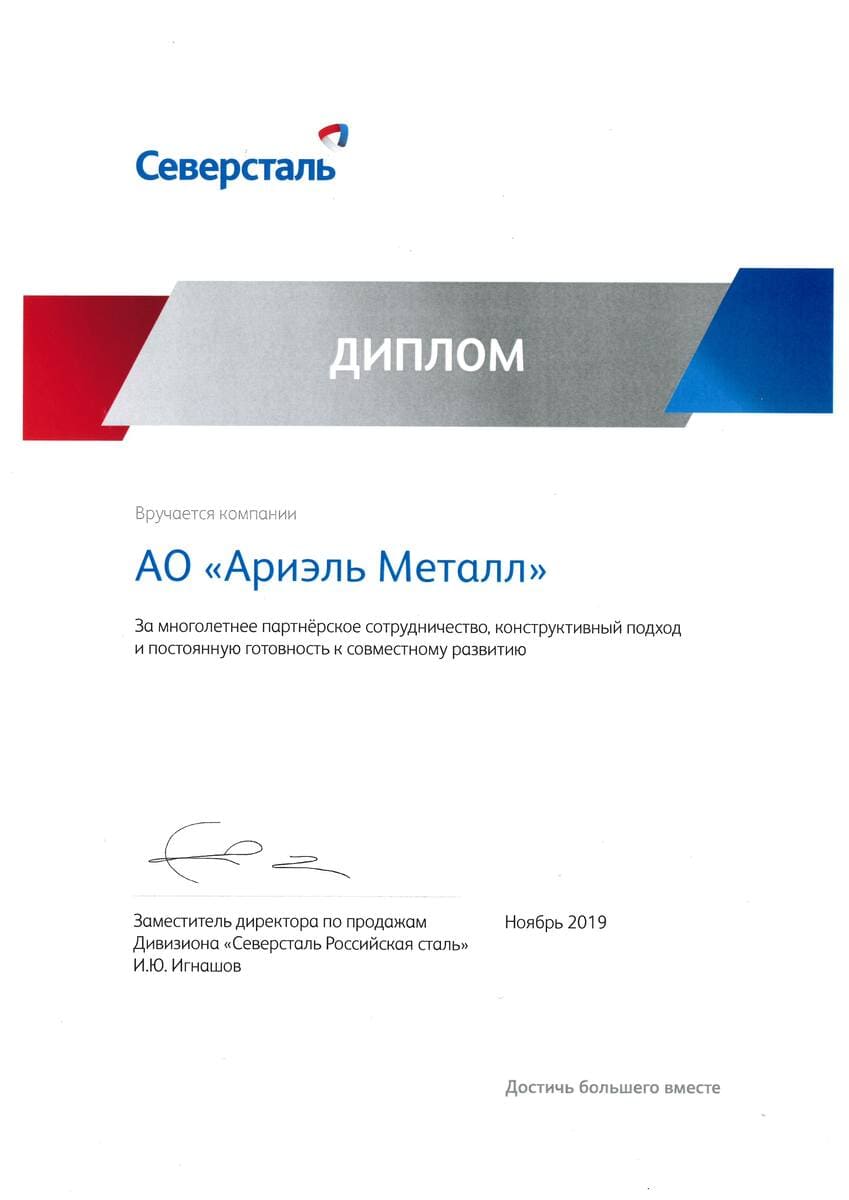Диплом за многолетнее сотрудничество Северсталь 2019
