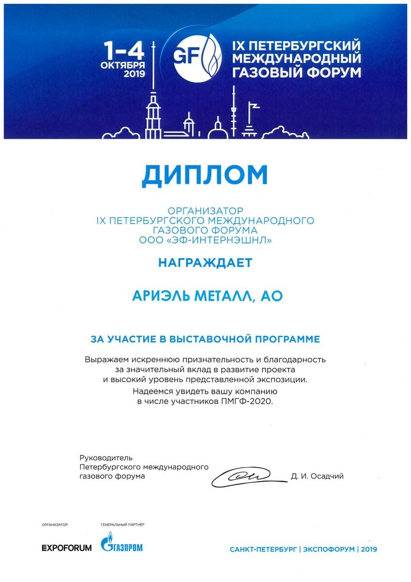 За участие в выставочной программе на IX Международном газовом форуме 2019 г.