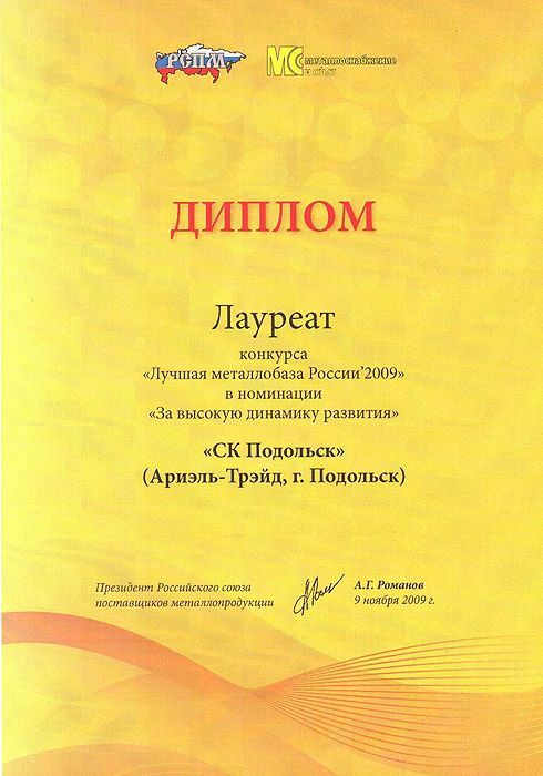 Лучшая металлобаза России2009 «За высокую динамику развития» СК «Подольск» 9 ноября, Москва
