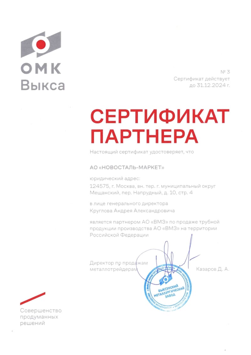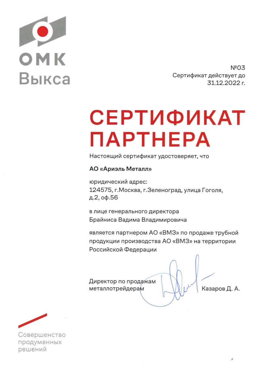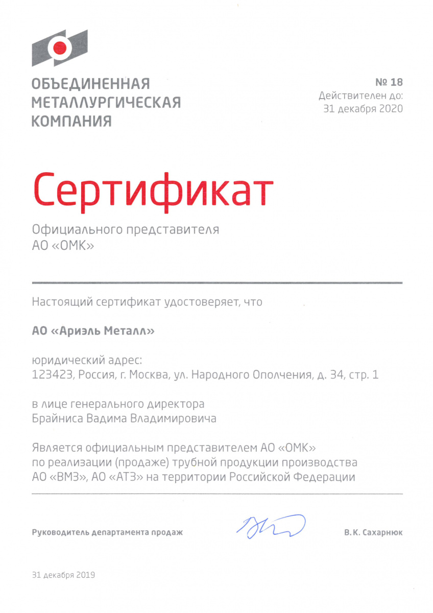 Сертификат дилера АО "ОМК" 2020 г.