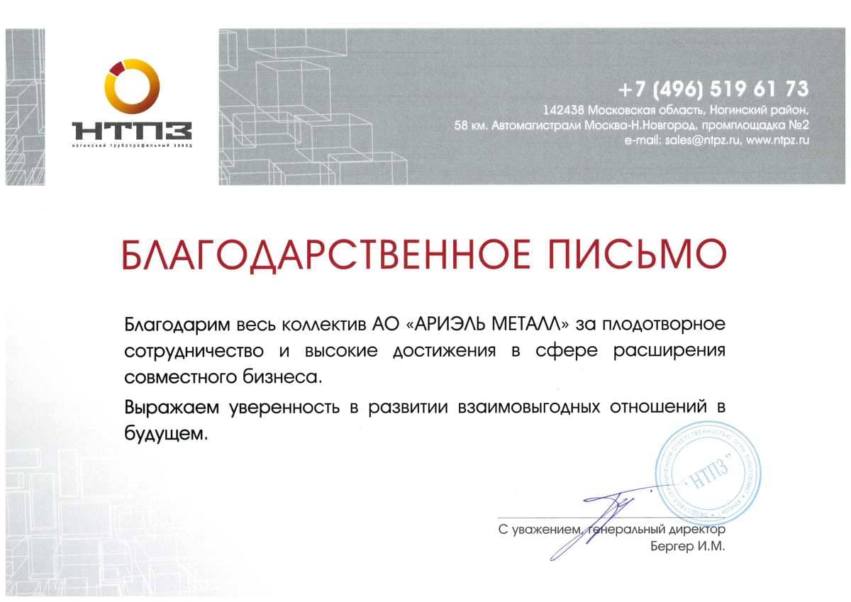 Благодарственное письмо НТПЗ