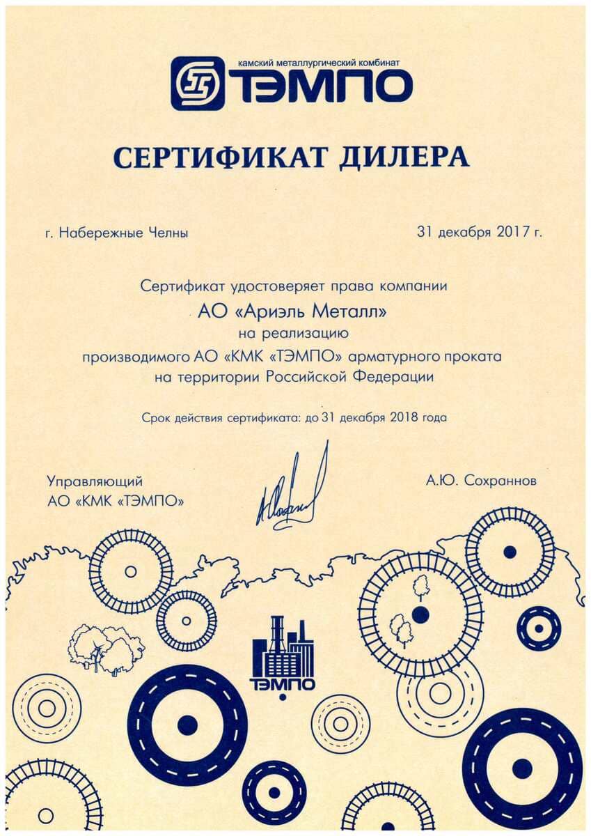 Сертификат дилера ТЭМПО 2017 г.