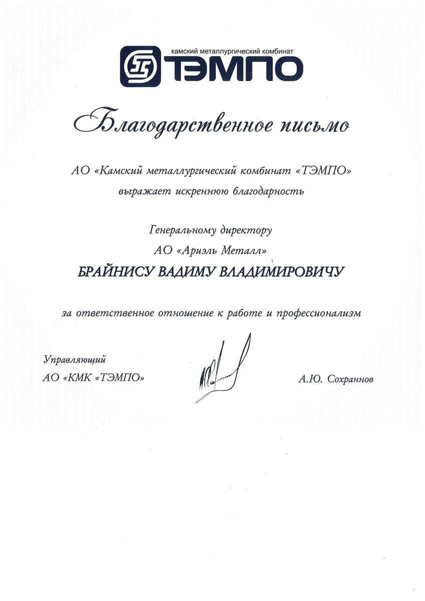 Благодарственное письмо ТЭМПО