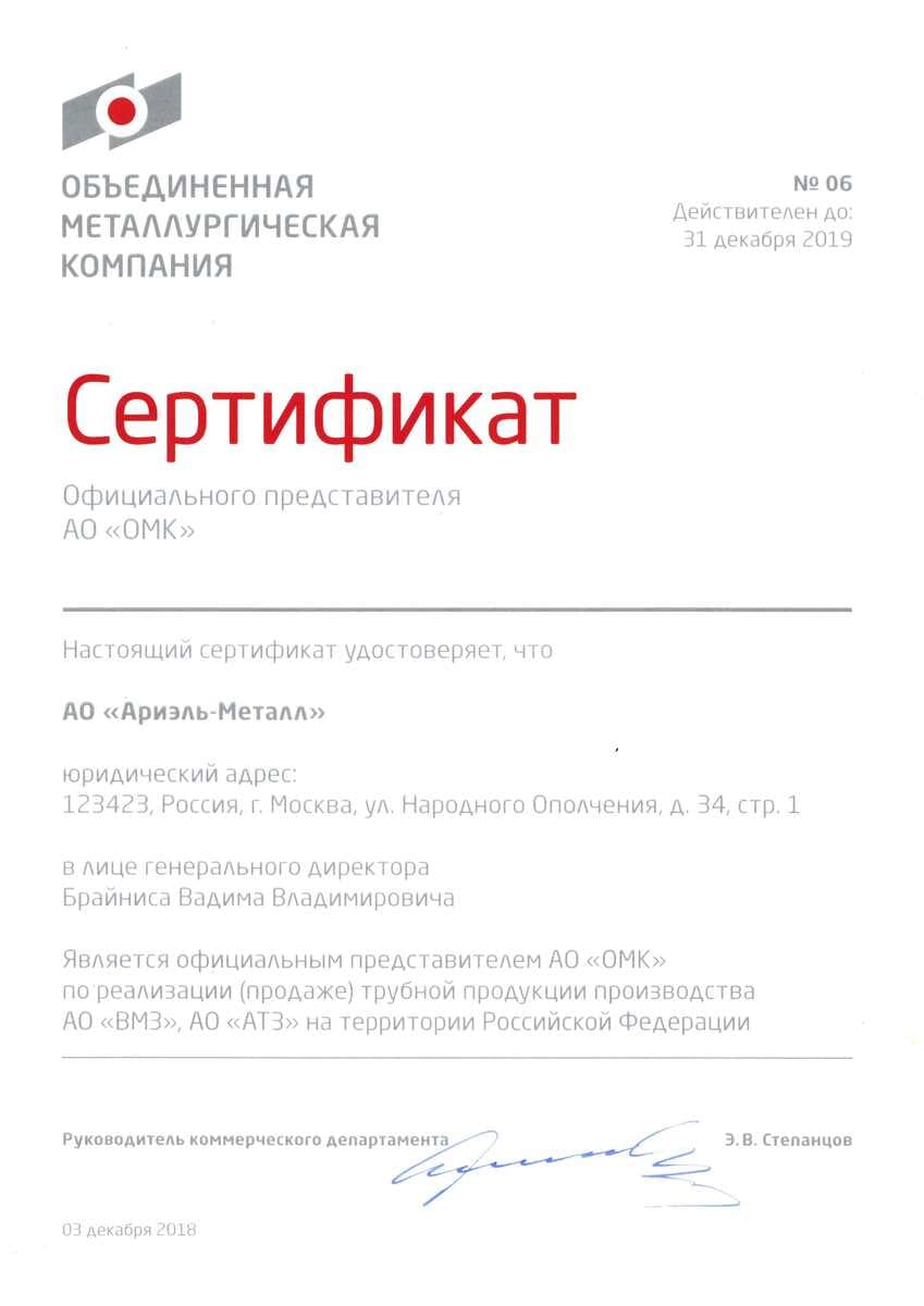 Сертификат дилера АО "ОМК" 2018 г.