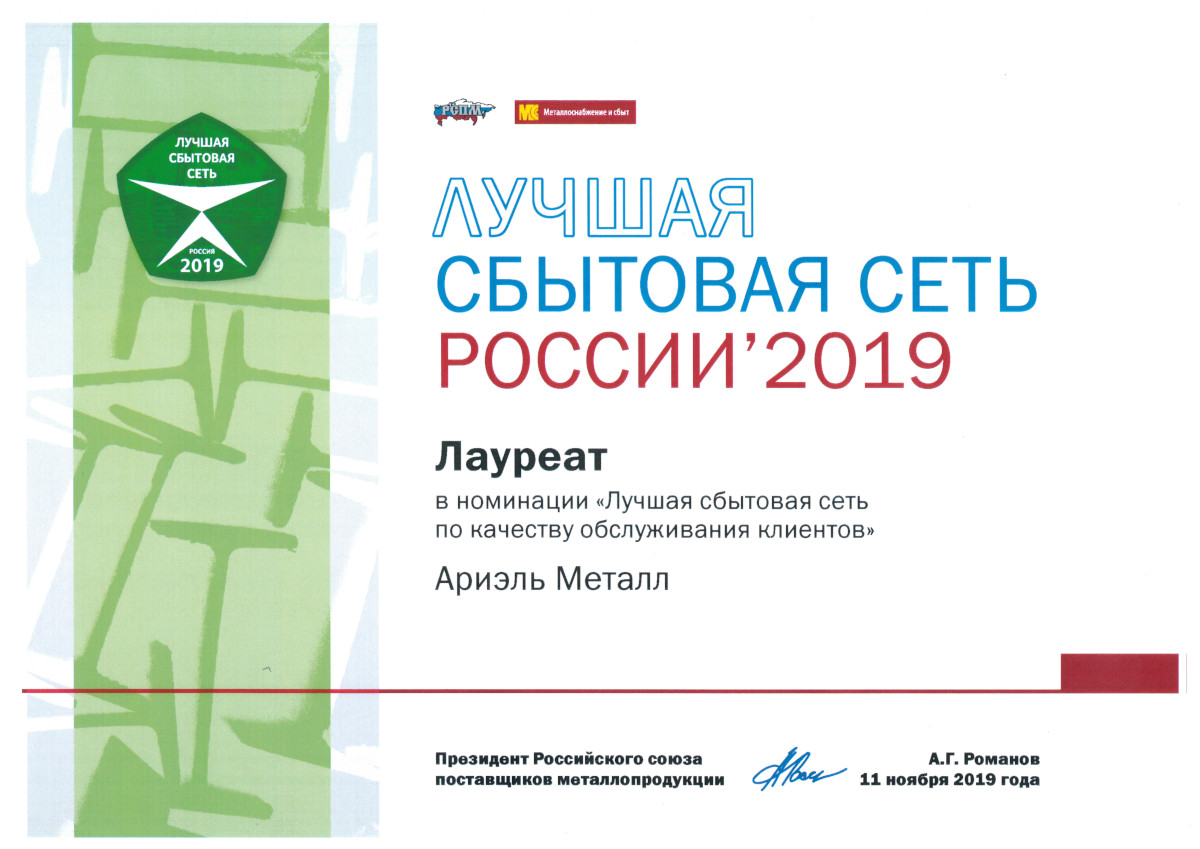 Лауреат в номинации «За лучшую сбытовую сеть по качеству обслуживания клиентов» 2019