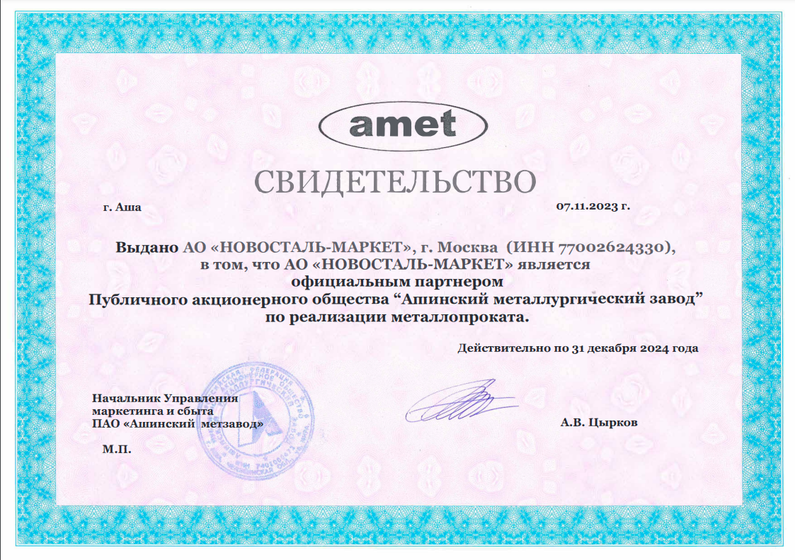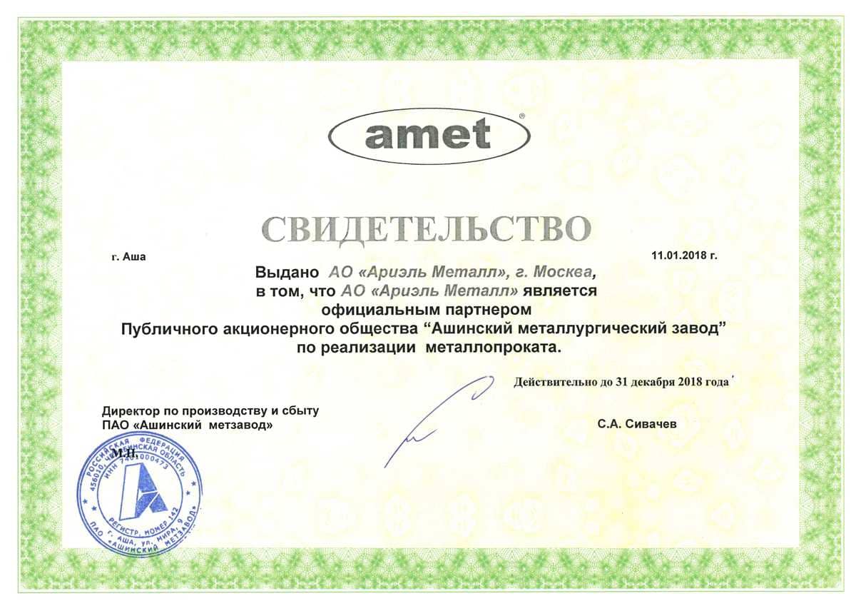 Сертификат партнера Публичного акционерного общества "Ашинский металлургический завод"