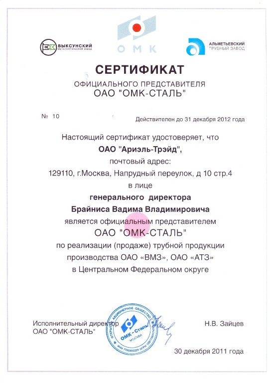 Официальный представитель ОАО «ОМК-СТАЛЬ» по реализации (продаже) трубной продукции производства ОАО ВМЗ и ОАО «АТЗ» в ЦФО 2012
