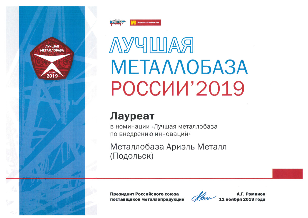 Лауреат в номинации «Лучшая металлобаза по внедрению инноваций» 2019